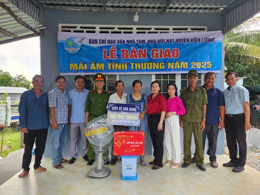 Căn nhà “Mái ấm tình thương” được bàn giao cho hộ gia đình bà Dương Thị Đỏ, ngụ ấp Tà Săng, xã Dương Hòa. Căn nhà có diện tích xây dựng 36m2. Kinh phí xây dựng 70 triệu đồng. Nguồn kinh phí do Giáo xứ Hòa Giang, xã Hòa Điền và Ban Chỉ đạo “Xóa nhà tạm, nhà dột nát” huyện Kiên Lương hỗ trợ 60 triệu đồng, phần còn lại do gia đình đóng góp thêm.