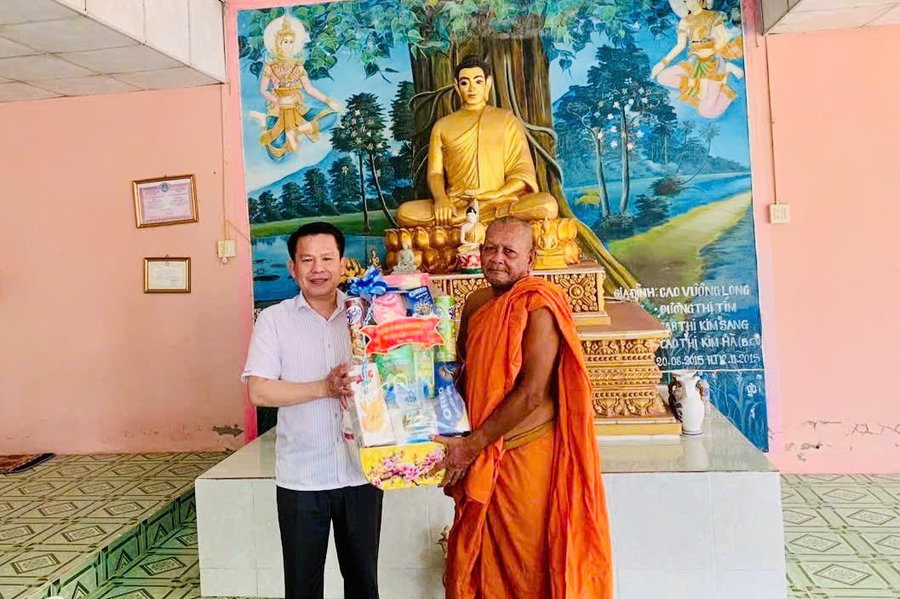 Đồng chí Lê Thanh Hưởng - Phó Bí thư Huyện ủy, Chủ tịch UBND huyện Kiên Lương tặng quà cho chùa Bãi Chà Và, xã Dương Hòa (Kiên Lương)