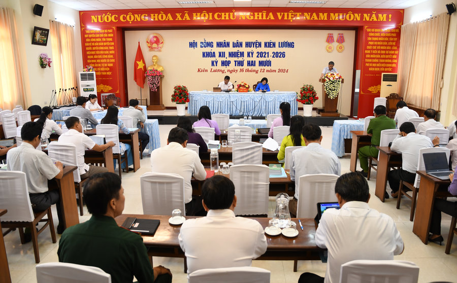 Sáng qua 16/12/2024, Hội đồng nhân dân (HĐND) huyện Kiên Lương khóa XII, nhiệm kỳ 2021 - 2026 tổ chức Kỳ họp thứ Hai Mươi (Kỳ họp Chuyên đề) để xem xét, giải quyết một số nội dung thuộc thẩm quyền HĐND huyện. Ông Ong Văn Đài - Phó Bí thư Thường trực Huyện ủy, Chủ tịch HĐND huyện và bà Lâm Thị Xinh - Huyện ủy viên, Phó Chủ tịch HĐND huyện chủ trì cuộc họp.