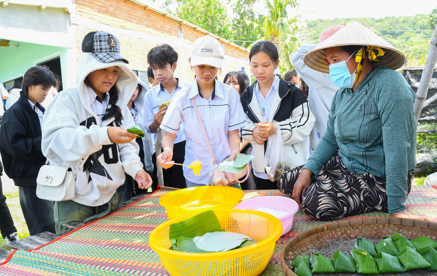 Chị Thị Lài (bên phải) hướng dẫn các em học sinh Trường Trung học cơ sở Bình Giang, huyện Hòn Đất làm bánh Thốt Nốt truyền thống của gia đình
