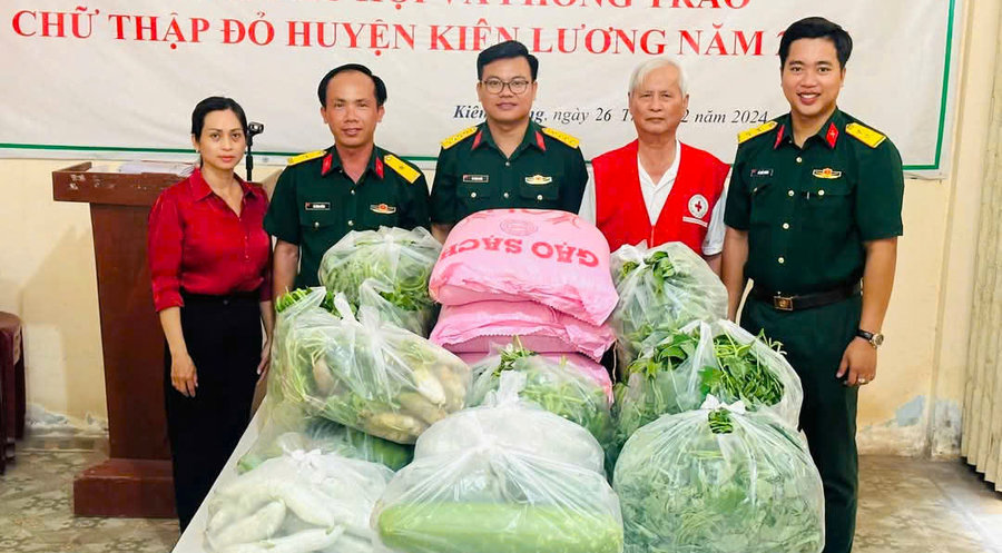 Cán bộ, chiến sĩ Tiểu đoàn 207 tặng gạo và rau, củ, quả cho đại diện lãnh đạo Hội Chữ thập đỏ huyện Kiên Lương